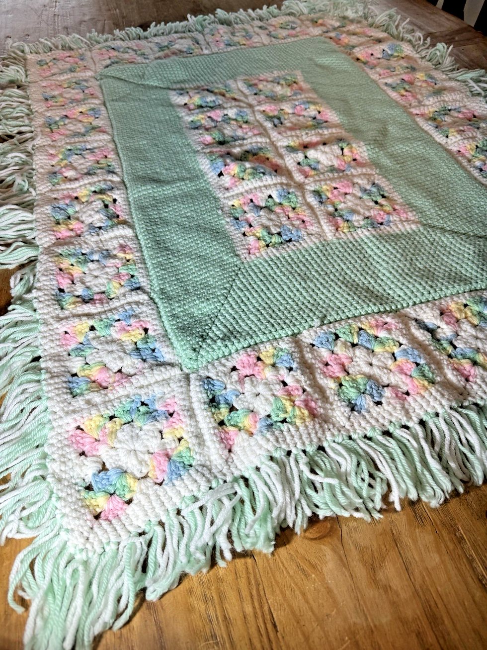 VTG Handmade Crochet Afghan Blanket Pastel Granny Square W/Fringe